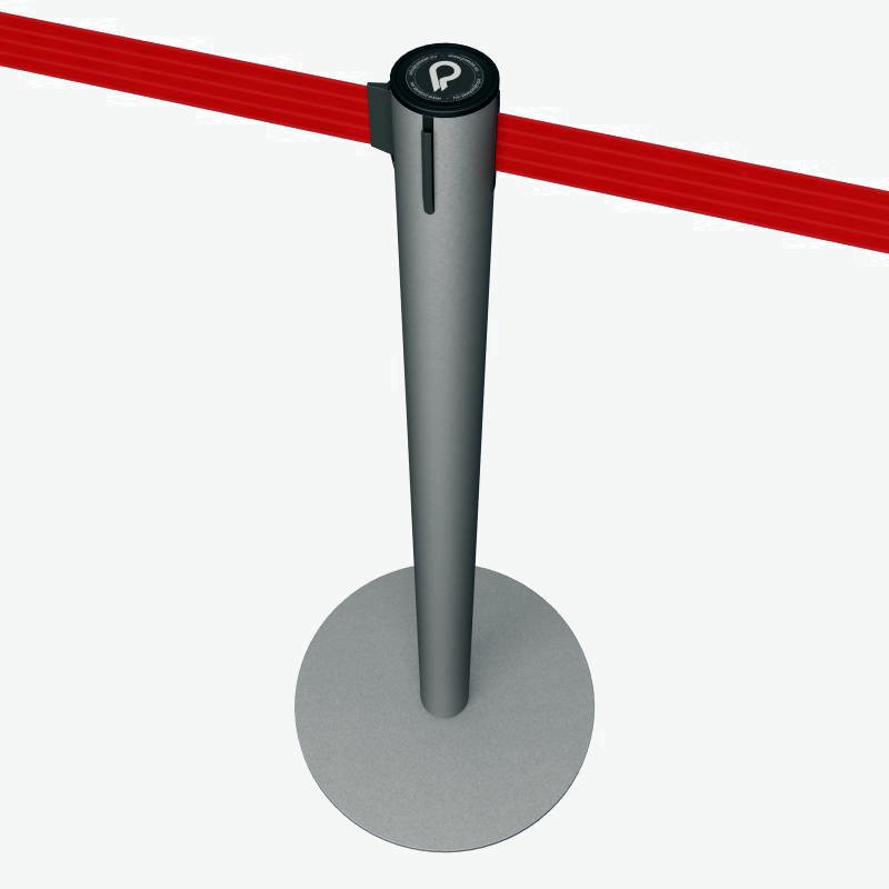 Gurtpfosten 2m auf mobiler Basis aus Epoxy beschichtete Stahl, silberfarbig.