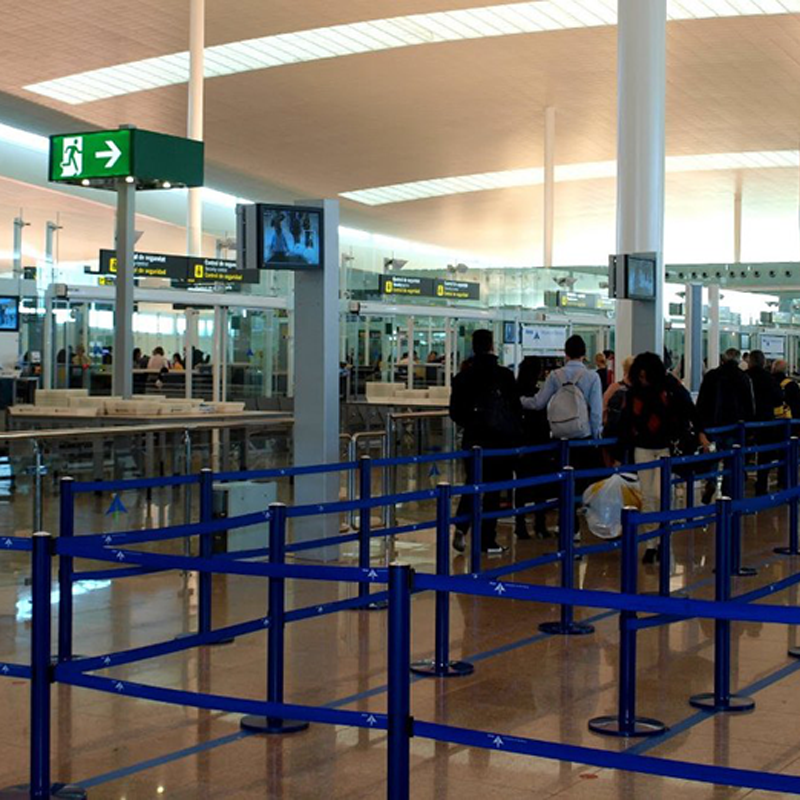 (0) Abgrenzungsständer mit 250cm ausziehbarem Gurt, blau pulverbeschichtete Edelstahl Fertigung.