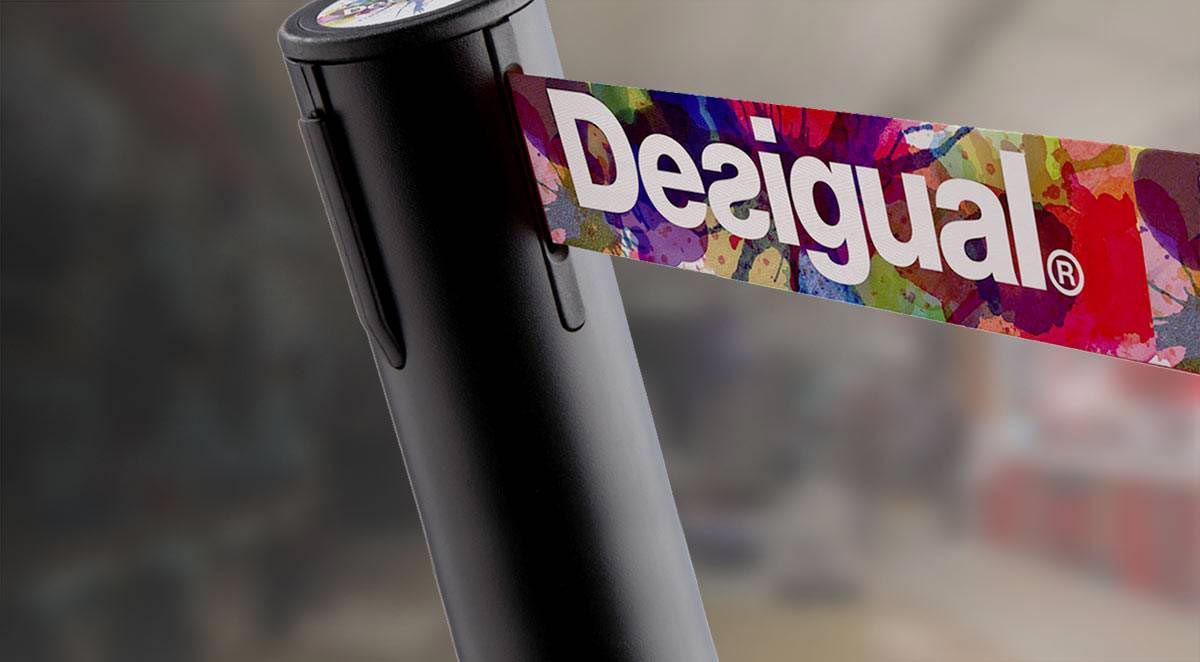 (0) Petit poteau (45cm) à sangle rétractable, sur socle mobile, de finition chromée. Impression numérique personnalisée de la sangle pour 25€ seulement! (10€/m)