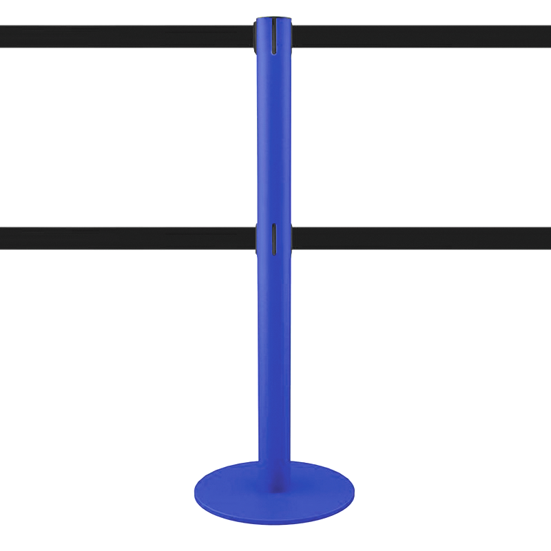(0) Afzetpaaltje met uittrekbaar lint, blauwe gepoedercoate roestvrijstalen afwerking.